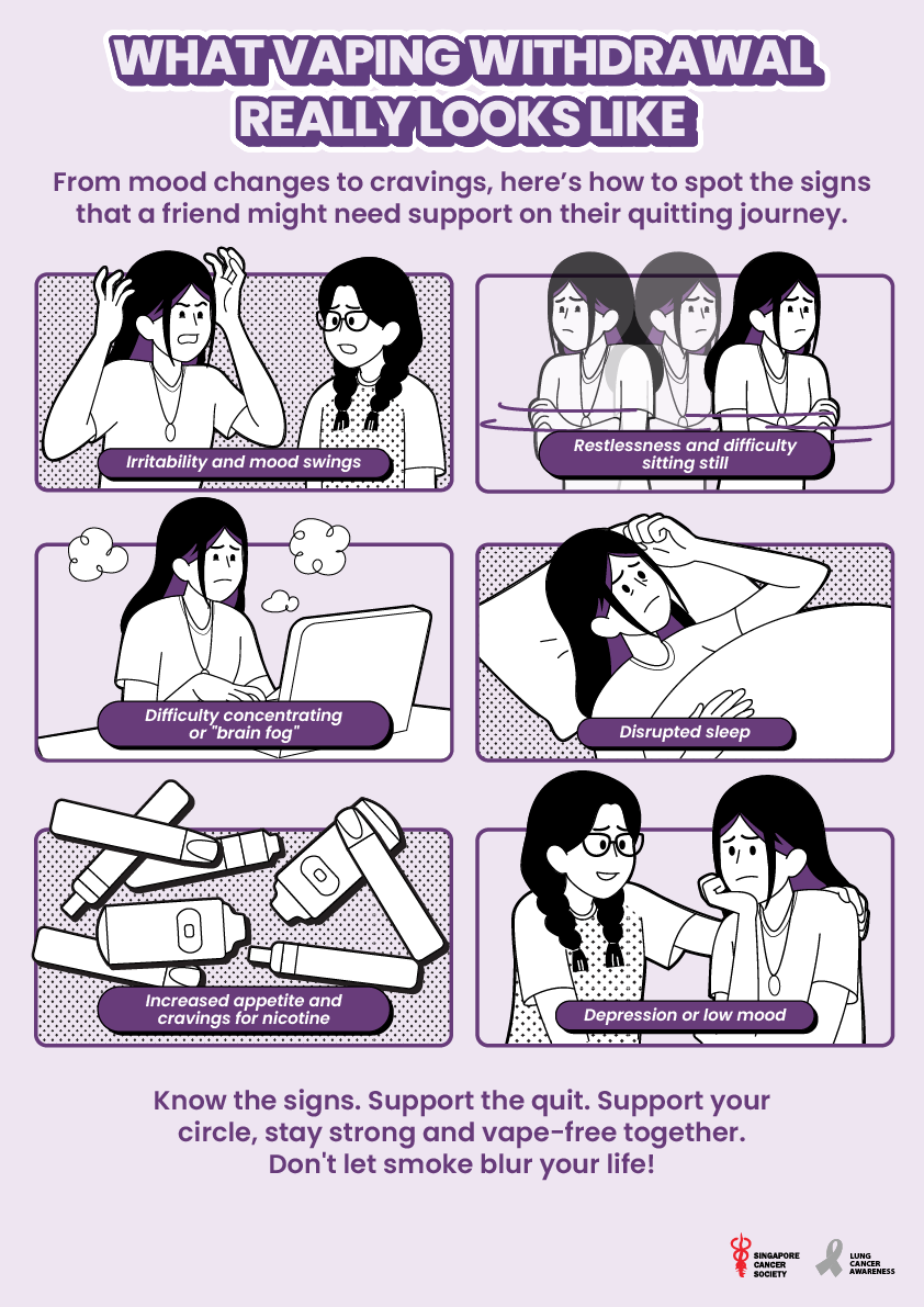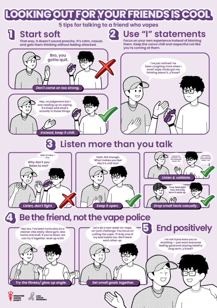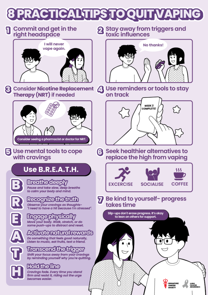 Tobacco Branch Hotline (6684 2036 / 2037): Callers get advice and guidance from trained staff on quitting smoking or vaping. Support is personalised and confidential.