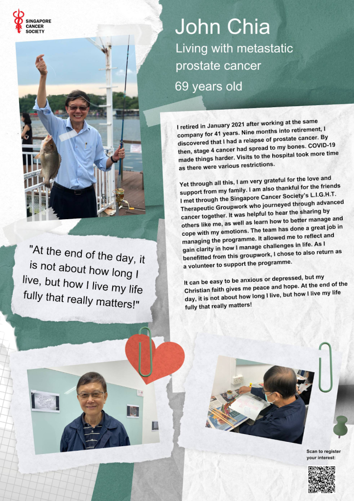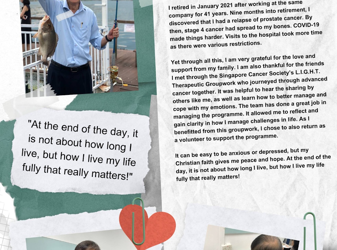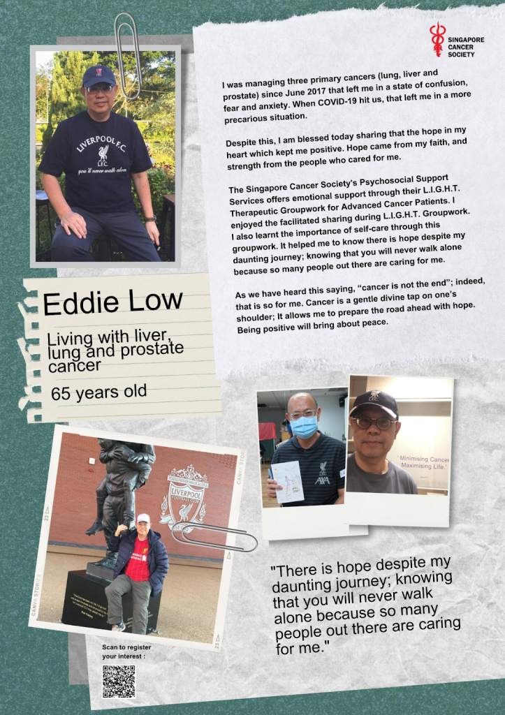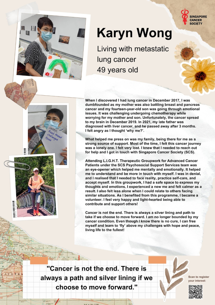 Singapore Cancer Society’s L.I.G.H.T. Therapeutic Groupwork for Advanced Cancer Patients is a groupwork session for stage 3 & 4 advanced cancer survivors focusing on helping participants to learn to live well despite their advanced cancer. Participants will be actively engaged in group dialogues and facilitated activities to express themselves, gain self-awareness and learn from one another.
